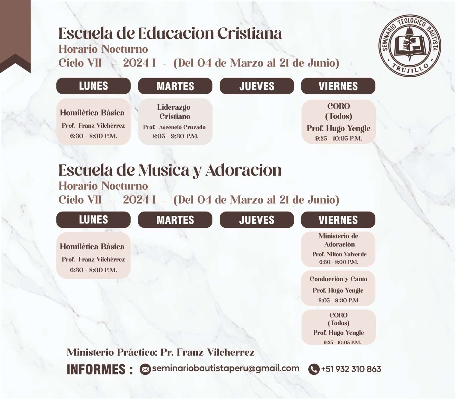 El Programa de Música y Adoración se desarrolla en seis semestres académicos, que hacen un período de tres años. Se desarrolla en horario nocturno, lo cual permite al estudiante alternar el estudio con sus deberes laborales o ministeriales. Al cumplir con todos los requisitos que exige este Programa, el estudiante recibirá el Diploma en Música y Adoración. Es ideal para ministros de música y adoración que ministran en la iglesia local.